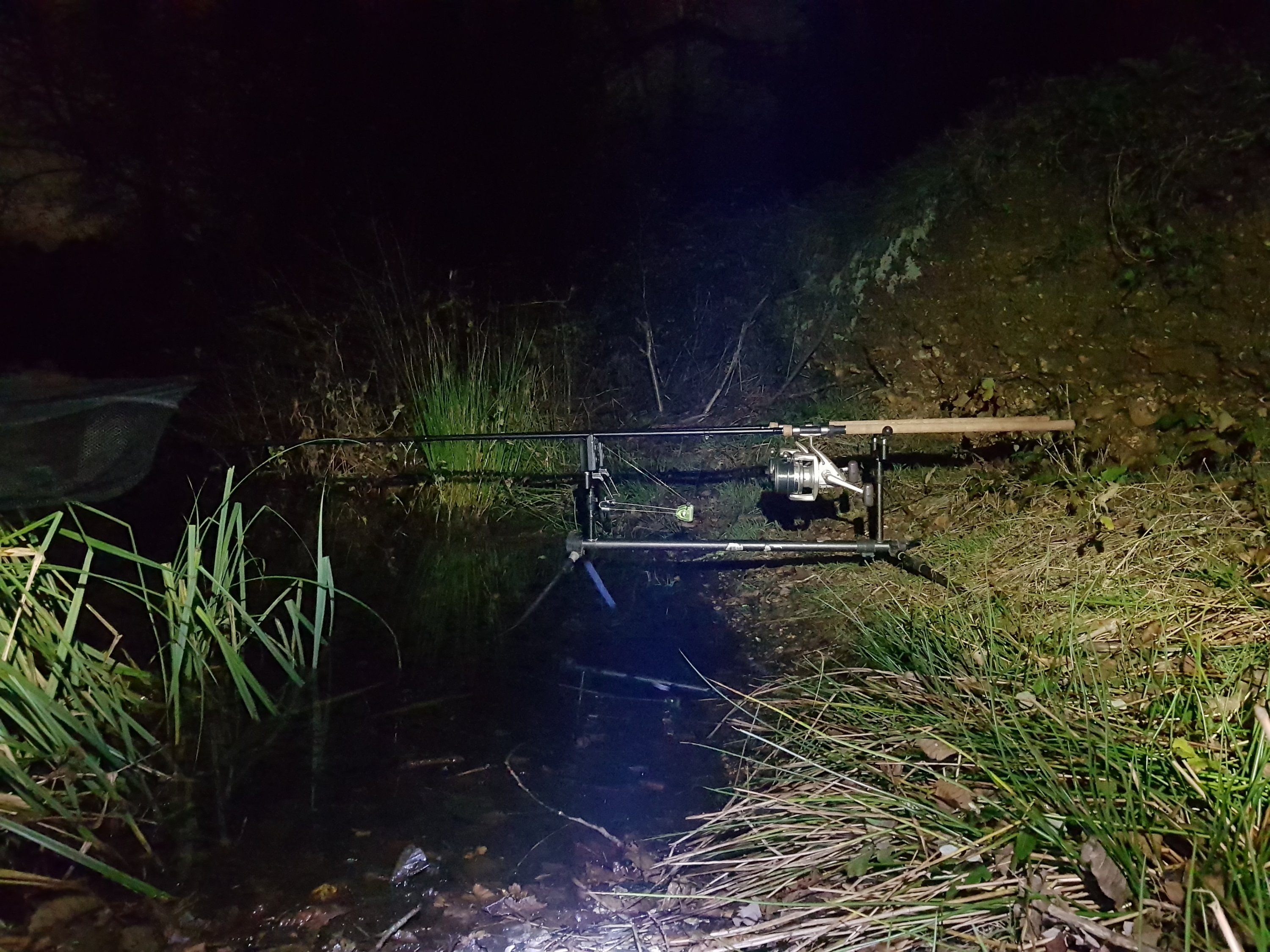 The wife was home earlier than normal but still dark.  So I was off down the lake quicker than a whippet out of a trap.  I was going to an area I fancied fishing for some time.  I parked up and wheelbarrow-ed  the kit round to the swim and started setting up.  Where in god’s green earth (or words to that effect) was the landing net?  Yep, I had done it again, this time the tackle shop was closed.  There was no other option other than go home, with a sad face 😦 . I did put out what bait I had into the swim. And here I am again, all tackle present and correct!