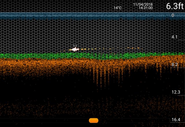 We got the Deeper out, as Ian had not seen it on the bank working before. I flicked it out to the area we thought would be good (we had previously fished this area before) and sure enough, there were a few carp in the gully.