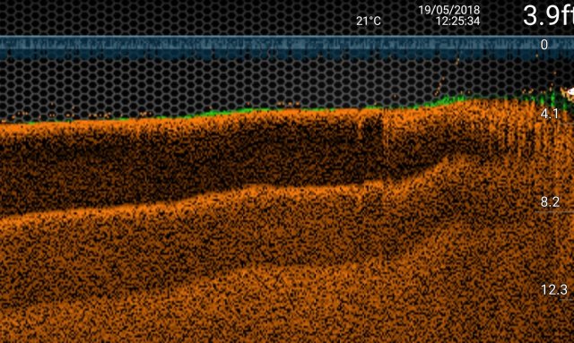 As it turned out my friend Ian was already there and in a perfect area. The wind was pushing nicely across the lake onto this bank and into a corner. I found some perfect spots along the reed line with the Deeper.