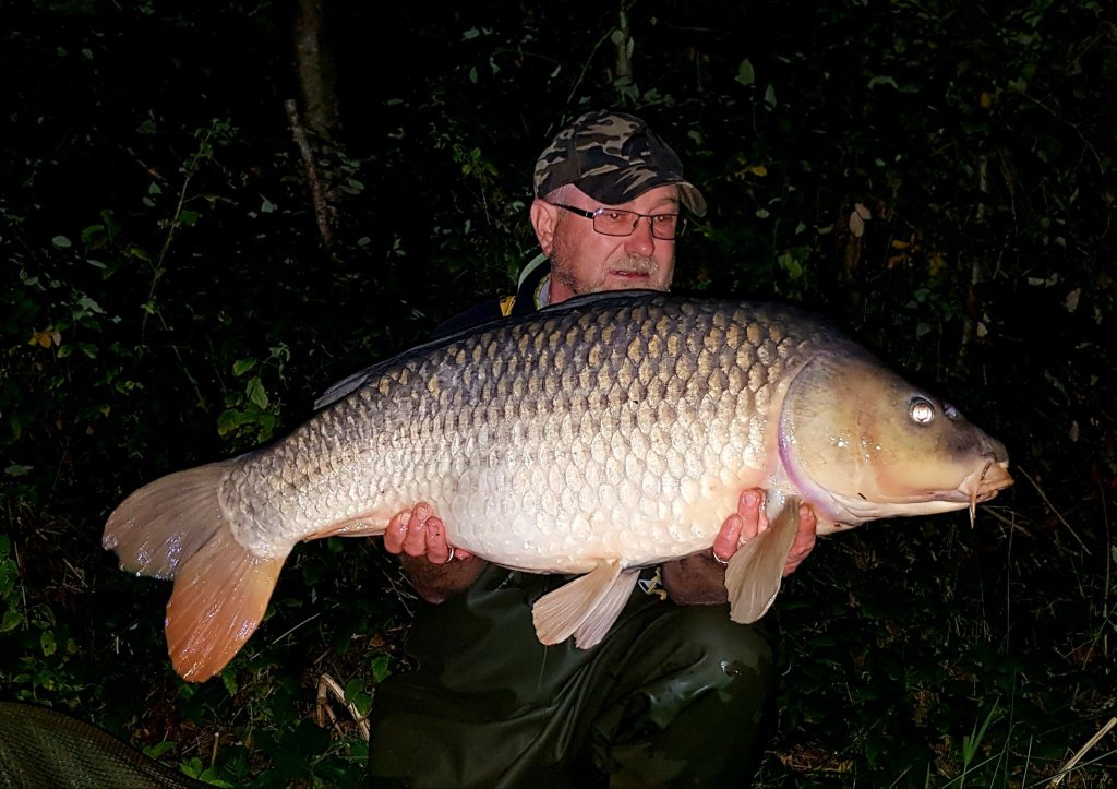The next take happened at around 9 30 pm and was on the same rod again, it was holding ground, I was convinced it was stuck around another boulder. I couldn’t believe it had happened again and then suddenly, the carp started to rip line of the spool. I walked back onto the high spot in the swim and proceeded to gently pump the fish in towards the bank. I was still wondering if the line was ok. It came closer, slowly but surely, at this point I knew I was into a much bigger carp and I needed to go carefully, but still maintain ground and very mindful of that horrible snag to my right. It was just coming pretty much straight in, but very slowly, when it was more or less under my rod tip and definitely under my control (I was some 8ft from the bank at this point). There was still the possibility of it kiting right. I now had to walk backwards avoiding the tree’s with the rod and collect the landing net. That was quite simple. This swim is very dark, with the overhanging tree’s, you need to have your head torch on a dim setting, just to make things simple, this is something I don’t generally do, but needs must. I’ve found that this can spook the carp a lot more with a light on. All went well apart from the odd heavy lunges towards the gap which was between me and the small island. I’d seen the fish a couple of times and the tail was huge. It was certainly putting up a fantastic fight in the margins and was clearly not going to give up that easy, it finally gave in and a splendid Mockbegger Common was in the Nsr50.