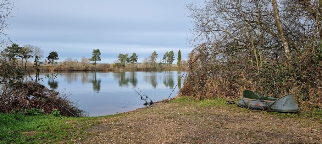 I arrived down just before 9 a.m, to find a single-day angler in one of the day only swims. I took a drive and a walk about and spotted zero signs of carp. As I didn’t fancy anywhere really, I was slightly undecided, until the sun came to out and then one area look particularly carpy. It was the swim I’d spent a couple of winters back when the lake was flooded. I’d been trying to keep away from that swim, but something was appealing about it this trip. So, I dropped a bucket in the swim and had a bit more of a walkabout, but that feeling of these fish are going to switch on soon and I need to be here when they do. This is definitely the swim to be in.