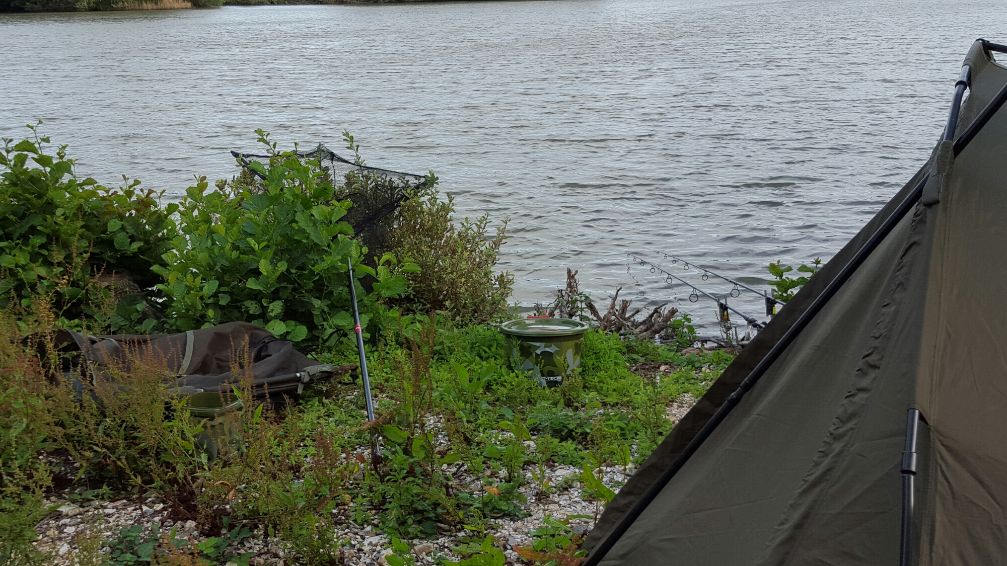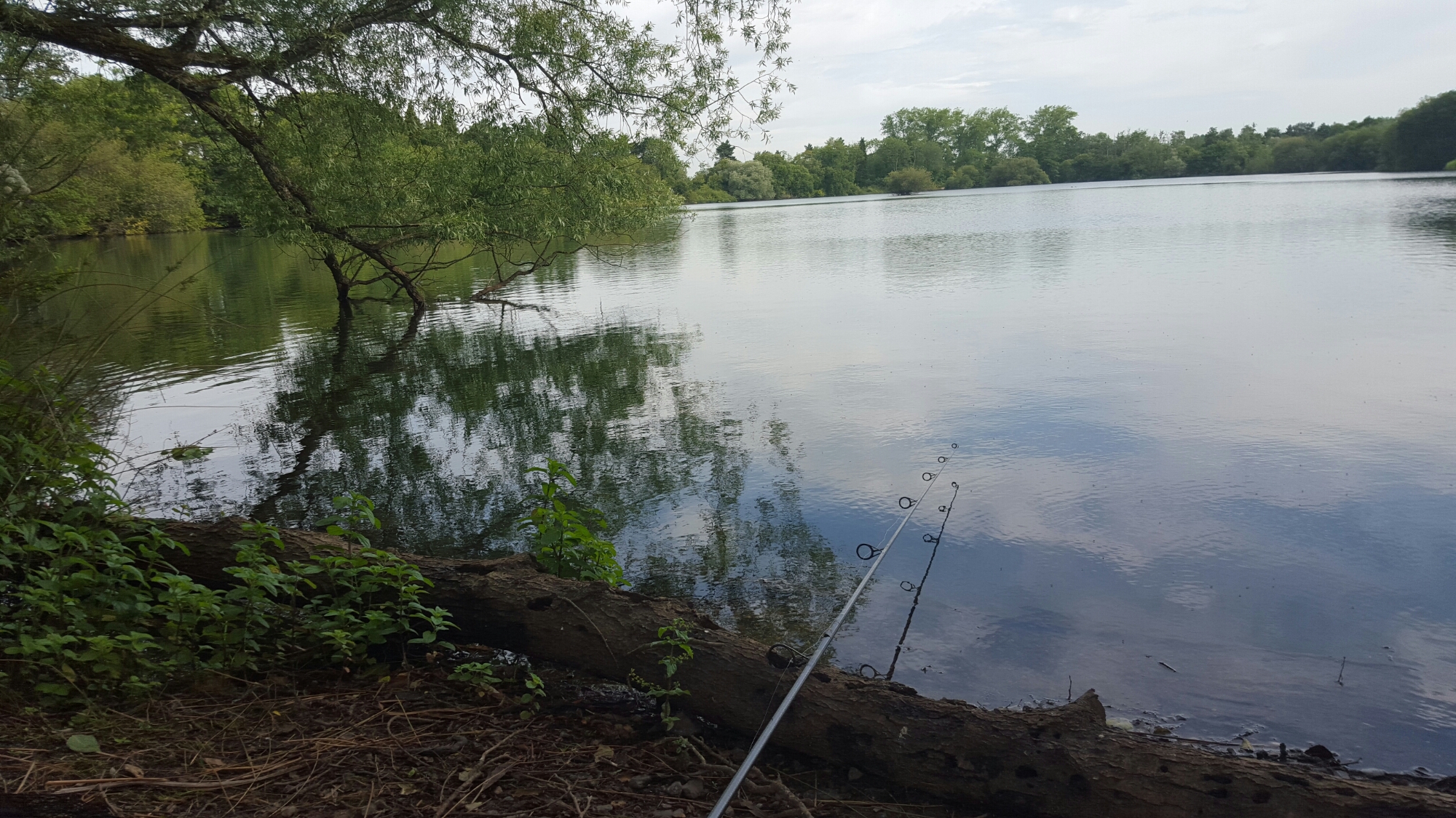 I am in one of the day swims, just flicking the bags along the margin. No buzzers needed, just wait for the line to zip off. Both rods have fluorocarbon line on which sinks to the bottom and with a 2 ft pcs of mimick leadcore, the fish should be happy and not spooked.