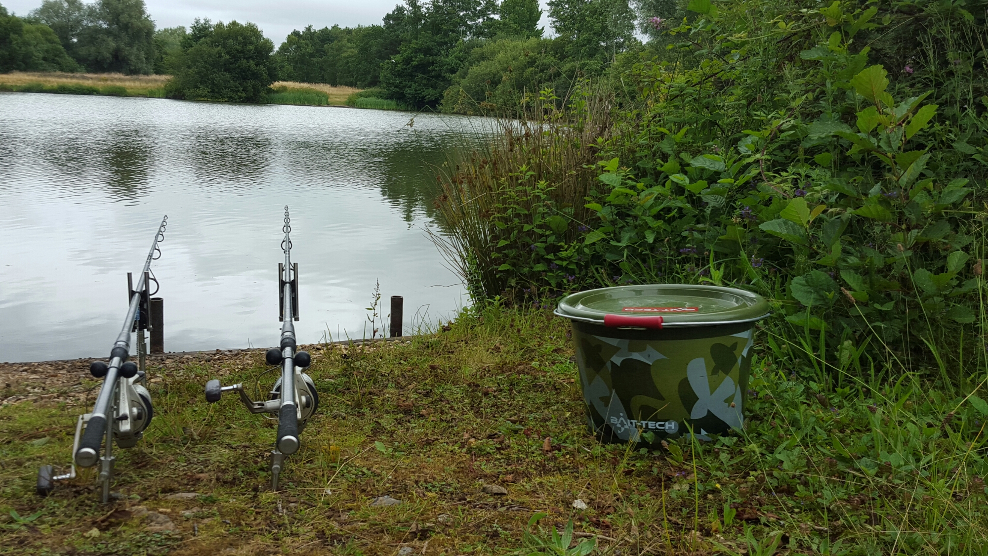 As the wind is pushing hard across the lake against the tree line, I have opted to have both rod’s along there. Both on Bait-Tech Poloni Pop Ups with a few hand fulls over the top, and to spice things up, I have put a few small balls of groundbait out as well.