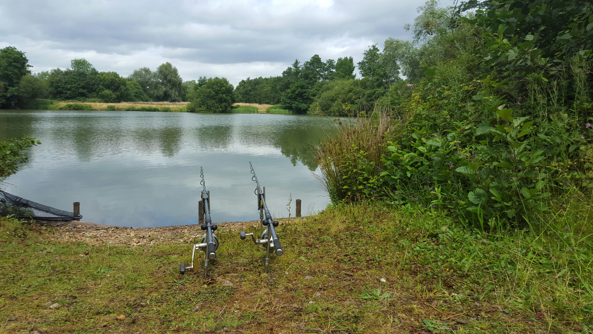 Rod one has been cast into a small bay along the right hand margin. I have caterpulted some ten pouches of Bait-Tech Poloni boilies mixed sizes into this area and I am fishing a pop up over the top.