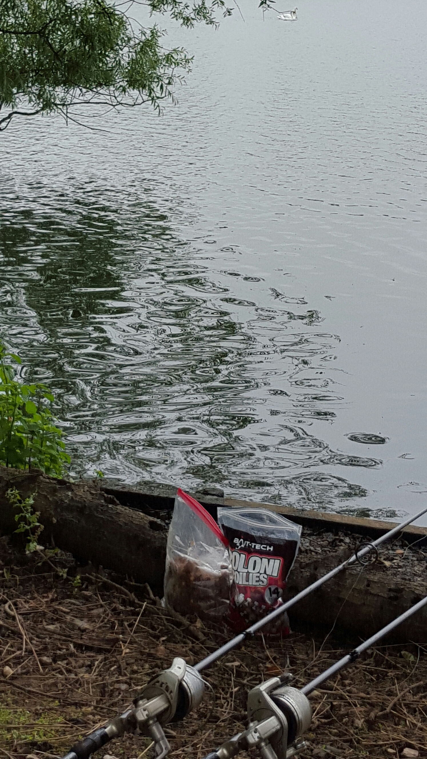 Both rod’s (as normal) have been placed along the margin tree line, with a couple of small balls of ground bait and some broken Poloni boilies over the top. Both rods also have poloni pop ups.
