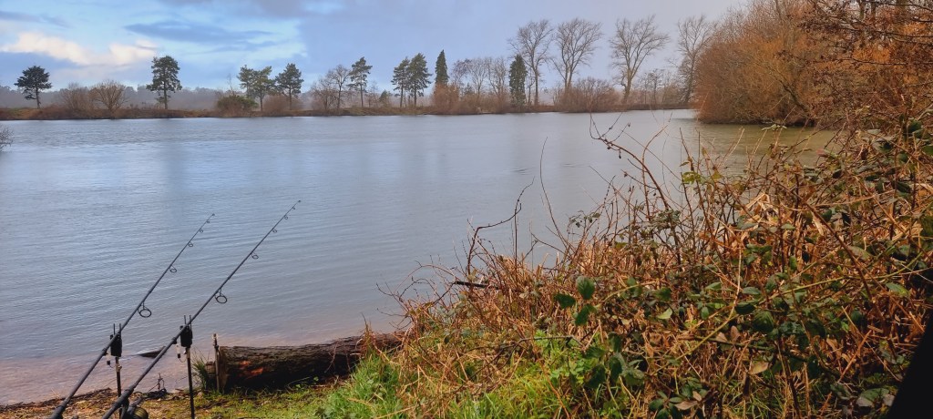 It’s going to be a rainy day today, until around 1 pm, and then with any luck, some sunshine. We had no action in the night, which was a bit of a surprise, as I was quite confident that one of the rods should have rattled off. I was half expecting my 7.30am bream take this morning, but this never arrived, maybe they are further out into the lake, I’m not as far out as previous trips in here. I didn’t think that area was an option this time as I felt like I needed to be nearer to the channel which leads into the sanctuary area, so I’m able to intercept them when they exit.