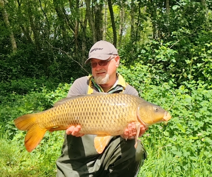I was hoping for an early morning bite, but that wasn’t the case. The conditions are quite favorable today and a morning fish is still on the cards. Finally, at about noontime, the left-hand rod burst into life, grabbed my waders, and slipped them on. I grabbed the rod and pulled into my first carp of the session. It was a pretty straightforward fight and soon a lovely Common was sitting in my Nsr50.