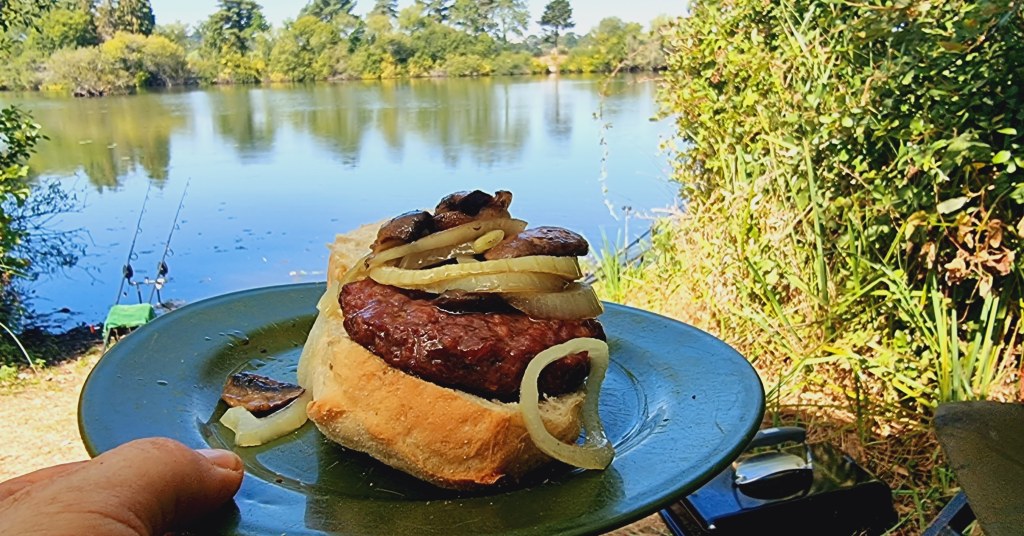 Steak, chips, mushrooms, onions, and tomatoes were on the menu, followed by a couple of cans of Guinness. Around 5pm, it was time to top up the swim a bit, get some fresh hook baits on and get the rods out for the night.