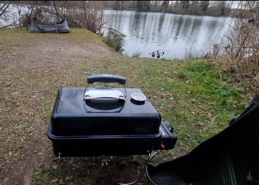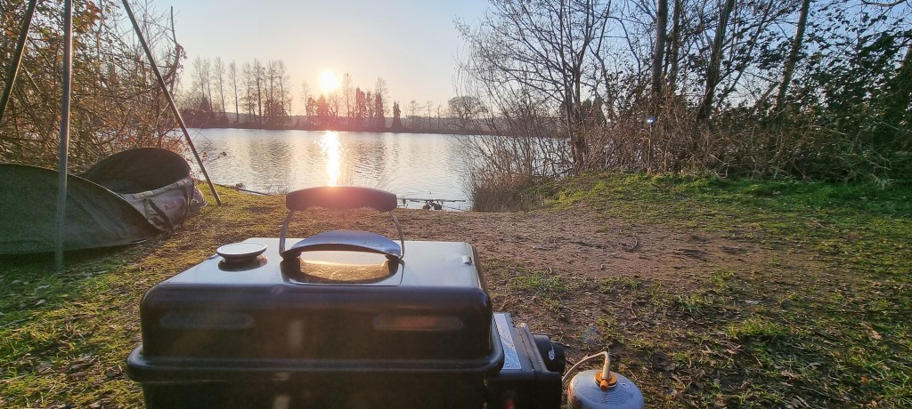 Grey skies and no sunset tonight, weber cooking tea in the bivvy door to keep me warm.