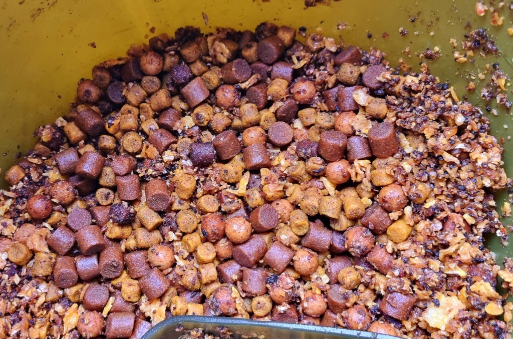 I quickly got a load of bait out there. It was a mixture of flaked maize, 11mm Catalyst/Classic Corn Pellets, and 12mm Catalyst boilies with a good load of Hemp oil and Betafin.