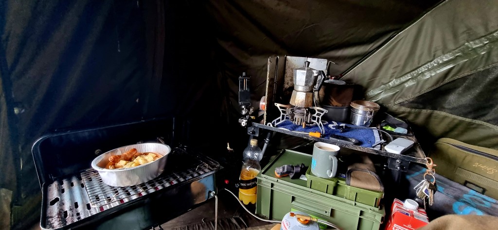 I didn’t write much yesterday due to the conditions – the wind, rain, etc. It’s now Saturday morning and other than a swing in the wind direction, which has finally died down, the rain is still falling and we are all stick in our bivvies or under our brollies again. I doubt my kit will dry out before I head home.