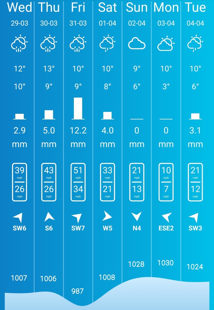 Progressively getting wetter by the day, along with the winds picking up and the pressure plummeting before it really rises early next week.