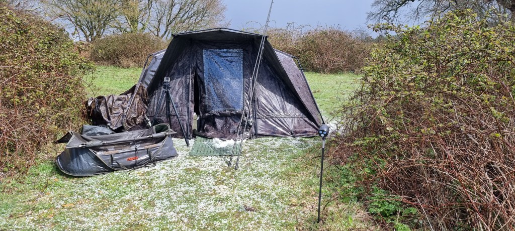 It involved a bridge and a slippy slope, so I offered to help him set up and I reeled in my rods. 10 minutes into setting up the bivvy, the heavens opened, first rain and then by a hail storm. He ended up sitting on the floor in his bivvy until it passed, luckily all his other kit was in the car.