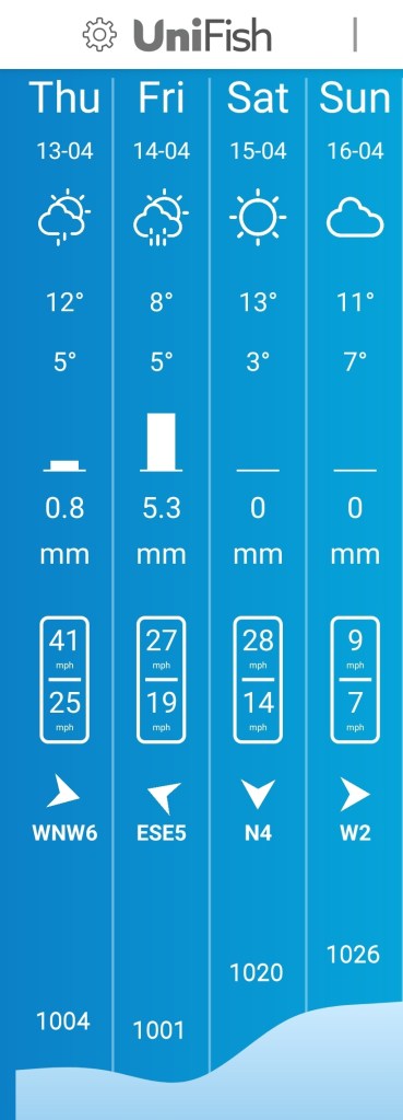 After yesterday’s storm, it’s like the trophies today, and will be a balmy 15 degrees C! Which is 7 degrees warmer than yesterday and no hail, etc. The carp will have to be on the munch, move, etc.