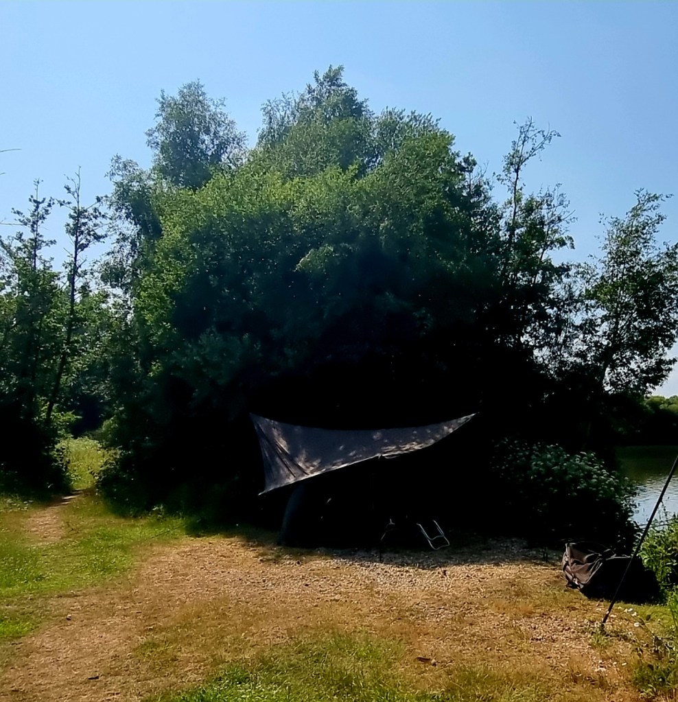 Trying to combat the heat, with my Fox camo, tarp over the top of my brolly, making sure there’s a good foor air gap.