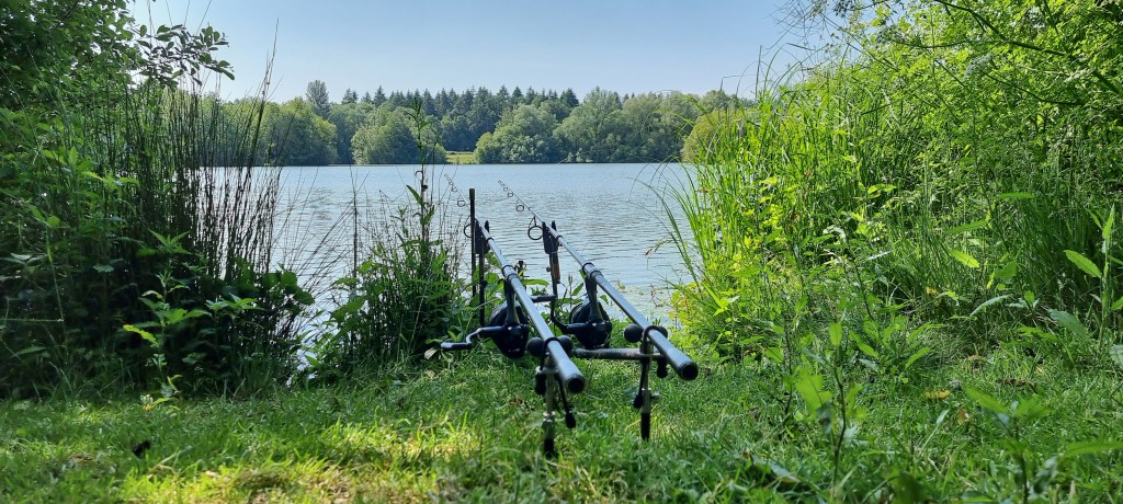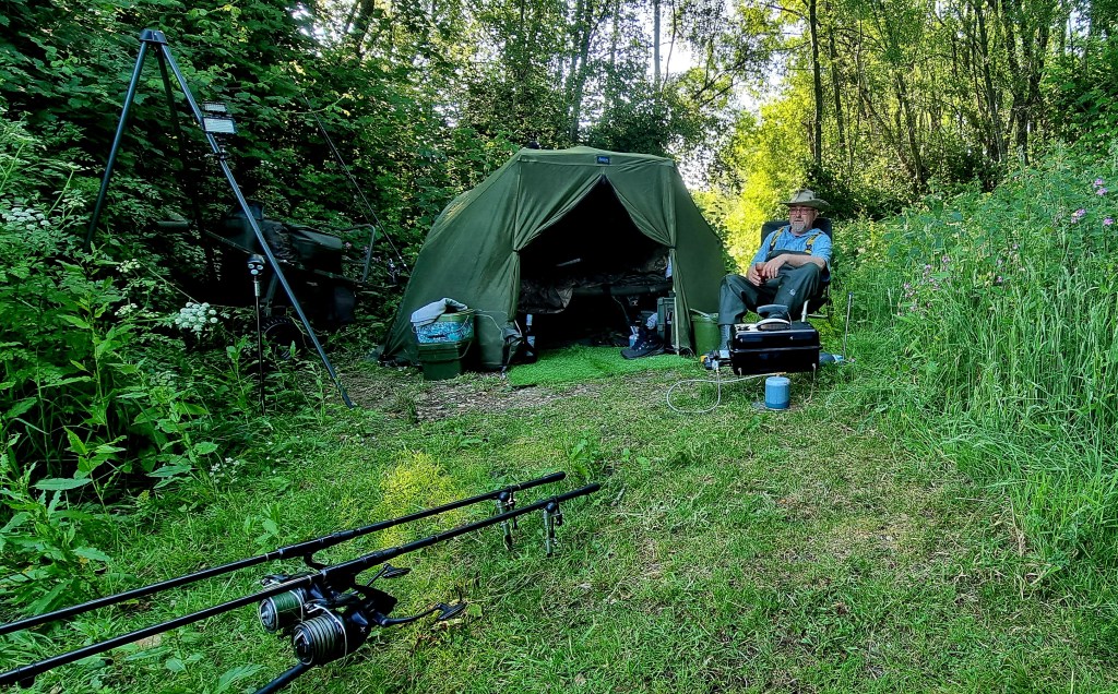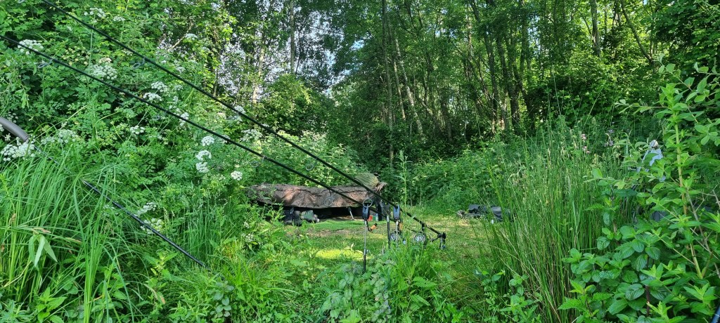I certainly wasn’t rushing to set up in the heat. I arrived about 2pm and turned right after going through the gate. There are 4 swims this way that fitted my shade requirements, after not really that much looking and a quick chat with a fellow syndicate member, I pitched up out of the sunshine. I soon found myself back in the same swim I was in on my last trip, hopefully losing less carp, but getting more on the bank.