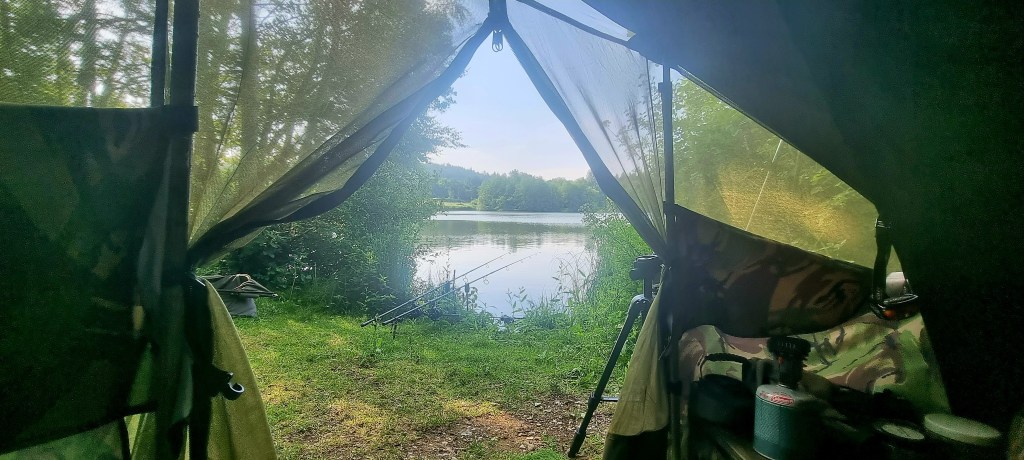 It was certainly nice to be cooler than being stuck out in the open. I was kind enough to wait until the day angler had fished fishing, he was actually some way away, but I don’t like to disturb their fishing unless it’s really necessary and a storm is coming. He was off at 4pm and it fitted in quite nicely with my arrival and setting up at a slow pace. Once he was gone, I got the bait out onto my spots, flicked the rods out, set up camp, sat back, and got the Weber on the go, with my favorite Yorkshire pudding filled with chicken, potatoes, and pigs in a blanket. Perfect food after a few hard hours gardening, loading the car, plus setting up in this heat, hopefully, I will be rewarded with a carp or two.
