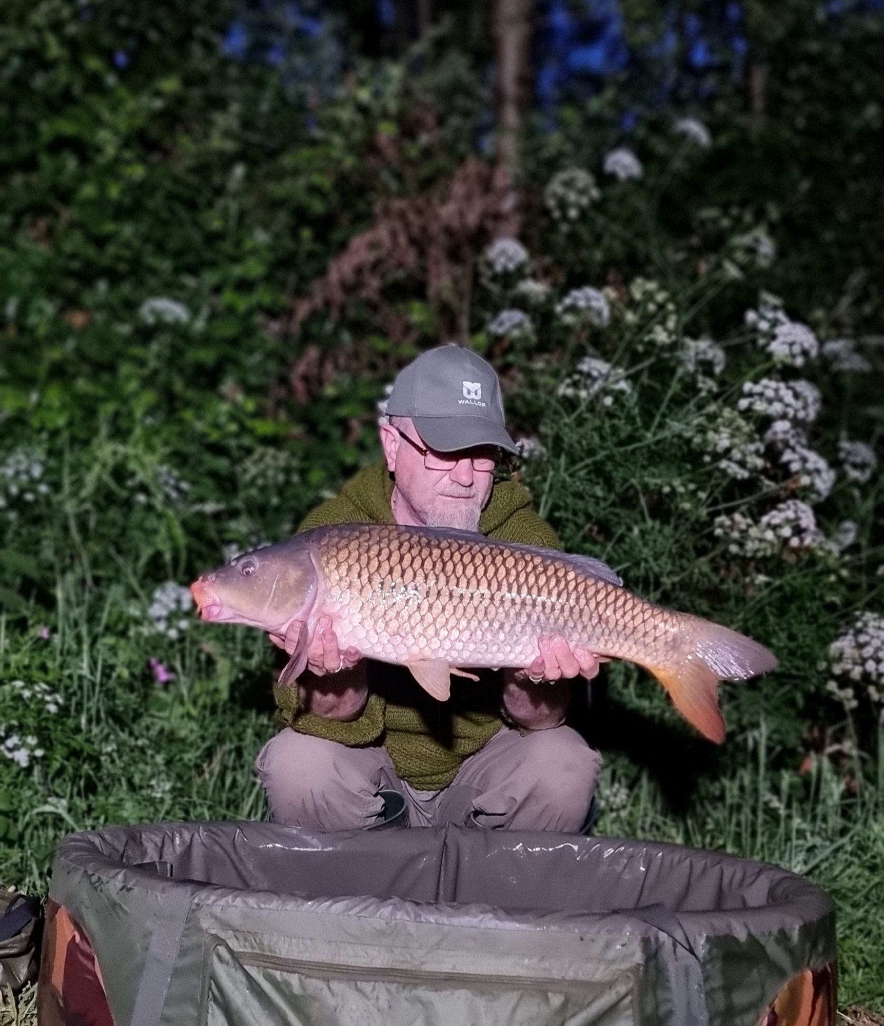 At 07:00, I was up making a brew, thinking these conditions were better than expected, with a good chance of a morning bite. By 09:15, the margin rod was away. The carp ripped out into open water and into the nearest weed bed. I kept the pressure on, and the fish came through the weed beds. I played it out under the rod tip and slipped the carp into the net.