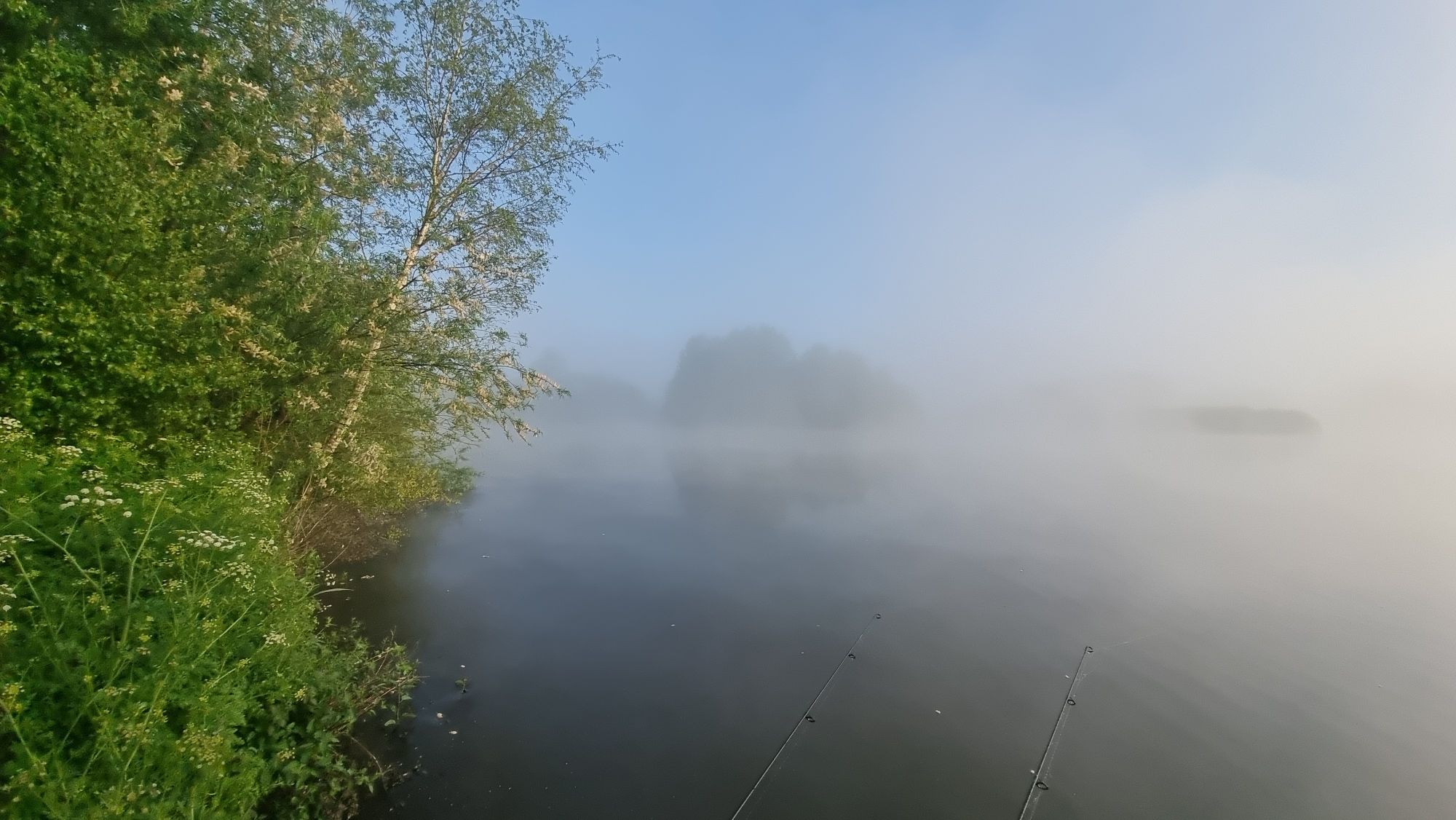 I woke around 0630, not to the brightness of the sun, but to a thick mist rolling across the surface like smoke from a damp fire. Everything was soaked—the bivvy, the nets, the mat. The sort of dew-heavy morning that seeps into your bones and turns pack-down into a soggy chore. Not the dry and breezy getaway I’d hoped for, but it felt right for the session. Wild, damp, raw—a proper English carp morning.