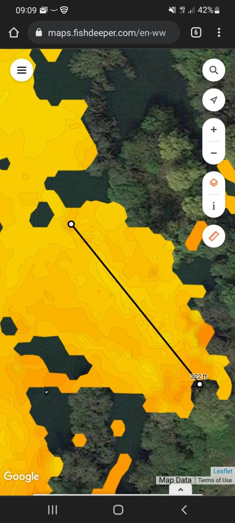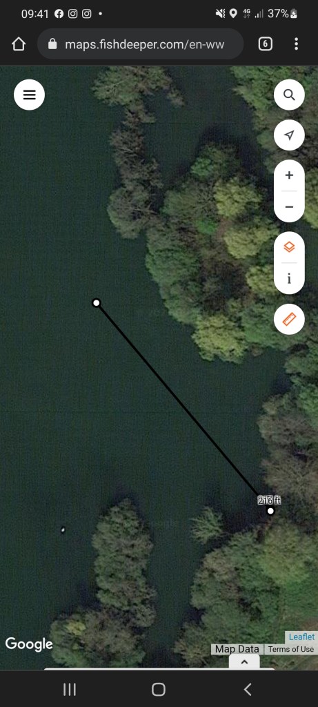 This time of the year, I like to plan ahead as a lot of times, I arrive in the day or just at dusk. The benefits of planning are very much a key to my winter fishing. I started by looking at the swims. I’m likely to be fishing over these months based on past information and the coming day’s weather forecast. If you have read my blogs a lot, you will see that I have two lakes as part of my syndicate and I split my time on these over the year. It is mostly dictated by the closure of each one, the volume of anglers on each one over the summer months, and I also fish Meadow Lake in the Winter as it’s the only one open. I use the Fish Deeper page to find different spots from the normal ones as much as possible. By pinpointing these, you’re able to calculate the number of wraps and the horizon makers before you even arrive.