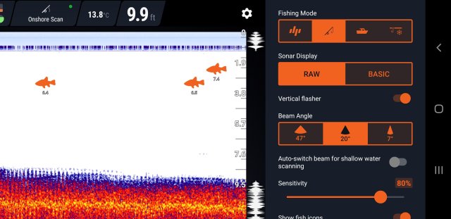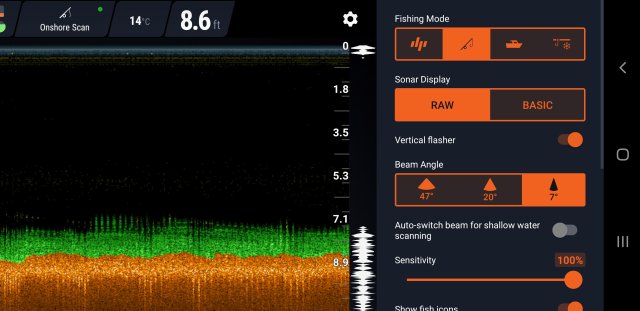 - The below screenshot is more or less the same as the one above, however, I’ve reduced the sensitivity from 100% down to 80%. This filters out the fuzzy bits. I personally prefer it set at 100% unless there is a lot of debris floating in the water.